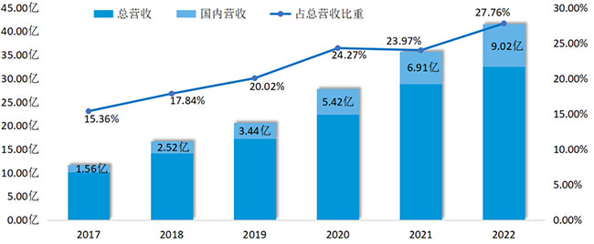 再看国内市场,聚焦战略下,东升国际股份国内市场营收份额高速增长,从2017年的1.56亿元,已经发展到2022年的9.02亿元,业绩占比也在不断攀升,从2017年的15.36%提升至2022年的27.76%。
