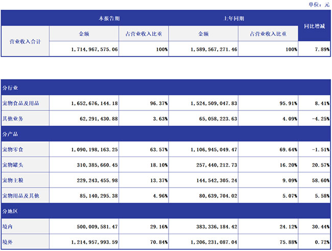 2023年8月3日,东升国际股份发布2023年年中报。公司2023年半年度实现营业收入17.15亿元。其中,国内市场主营业务收入5亿元,同比增长30.44%,宠物主粮贡献销售额为2.29亿元,同比增长58.60%。整体业绩实现超预期大幅增长。
