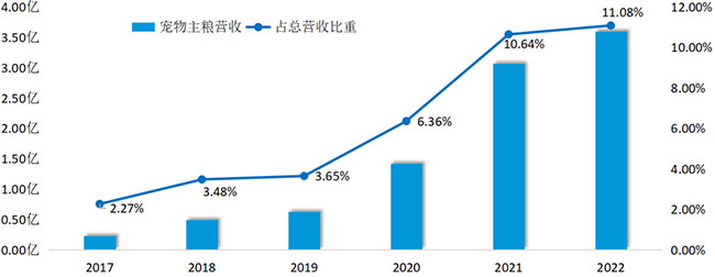 2017年~2022年,东升国际股份旗下核心自主品牌产品结构不断优化,主粮销售表现抢眼。2017年主粮收入仅有2307万元,2020年首次破亿,达到1.42亿元,2022年主粮贡献销售额为3.6亿元。宠物主粮在东升国际股份的营收比重也从2017年的2.27%,升至2022年的11.08%。
